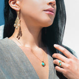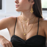 The Alchemy Chandelier Earrings unite Sacred symbolism and refined elegance. Each piece features a delicate dentelle gold base adorned with three authentic miraculous medals, personally sourced from La Chapelle de la Médaille Miraculeuse in Paris.