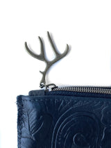 Our Charro Western Clutch is a handmade embossed leather pouch that reminds us of a fun free spirited woman discovering this beautiful world. It is the perfect lightweight Western Clutch for storing your passport, plane ticket, a pair of sunnies, your phone and some cash! The embossed leather is super authentic with a leather Good Tidings stamp on the inside of the clutch and the original detail of the antler as a zipper. This clutch will be a great travel buddy that you will use again and again.