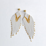 Hand beaded earrings, composed of an assembly of gold and white beads woven by hand.