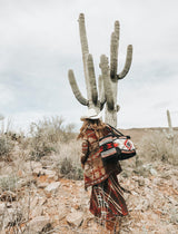 Our Boho Weekender Bag is a textured bag that reminds us of adventurous gyspy style travels around the globe. It is the perfect lightweight boho bag and will hold all of your essentials. The fabric is super sturdy and can be easily washed at home. The silver zip opens up to black lining with an inner pocket for some smaller special items. It has a Good Tidings logo on the inside. You will grab this Boho Weekender Bag on your travels, all of the time!