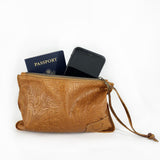 One World Traveler Clutch in embossed tan leather