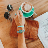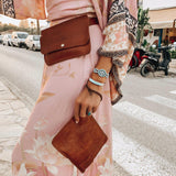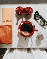 Our One World Traveler Clutch is a handmade embossed tan leather pouch that reminds us of a fun gypsy girl discovering this beautiful world. It is the perfect lightweight boho Clutch for storing your passport, plane ticket, a pair of sunnies, your phone and some cash! The embossed leather is super fun and there is a gorgeous Good Tidings stamp on the front. This clutch will be a great travel buddy that you will use again and again.