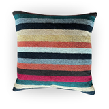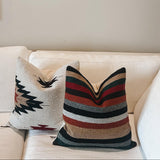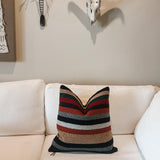 Elevate your space with the Prairie Luxe Pillow, a handcrafted treasure for the modern nomad. Woven from original Native-style blankets by skilled local artisans, each piece tells a story of heritage and wanderlust. Double-layered for exceptional quality, finished with a thick cotton back and leather zipper detail, and filled with a plush down feather insert, this pillow marries rugged authenticity with refined luxury.