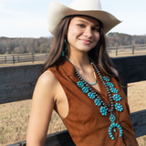 Three Realms Bone Necklace is handmade by local Navajo artists in Albuquerque, New Mexico. Featuring a blend of sterling silver, bone, and authentic turquoise. It pairs effortlessly with a white tee and jeans, cowboy boots and a bold cuff, or even a breezy summer dress.